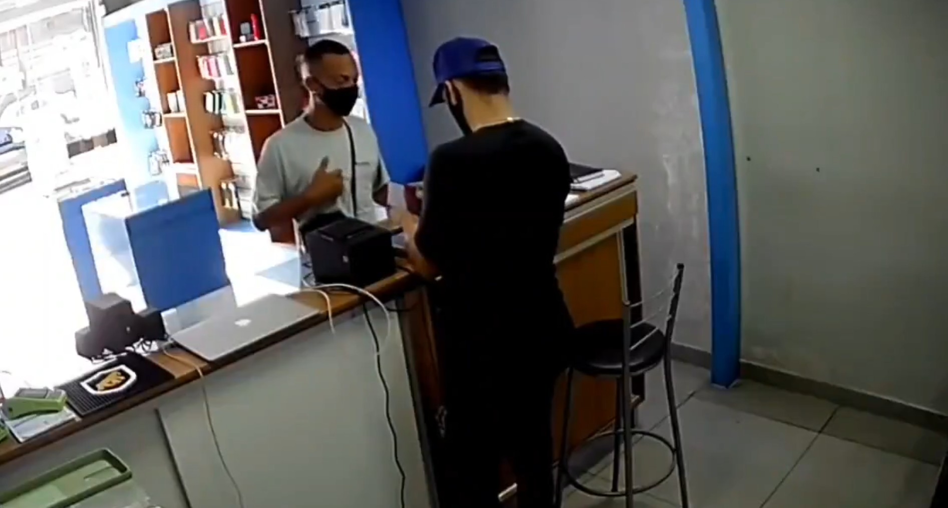 El empleado, aparentemente sorprendido por la situación, retrocede y permite que el hombre se acerque a la caja donde se guarda el dinero.